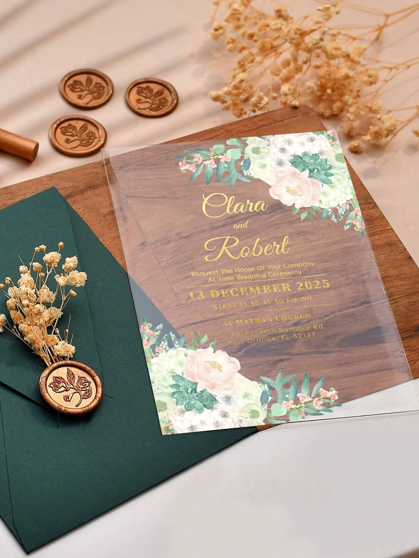 By starting with acrylic invitations, you establish a key visual element—the material itself—that can be echoed throughout your wedding décor. This early introduction creates a strong sense of continuity that will be appreciated by your guests. Imagine their delight when they see the same sophisticated clear material used for other details on your special day.