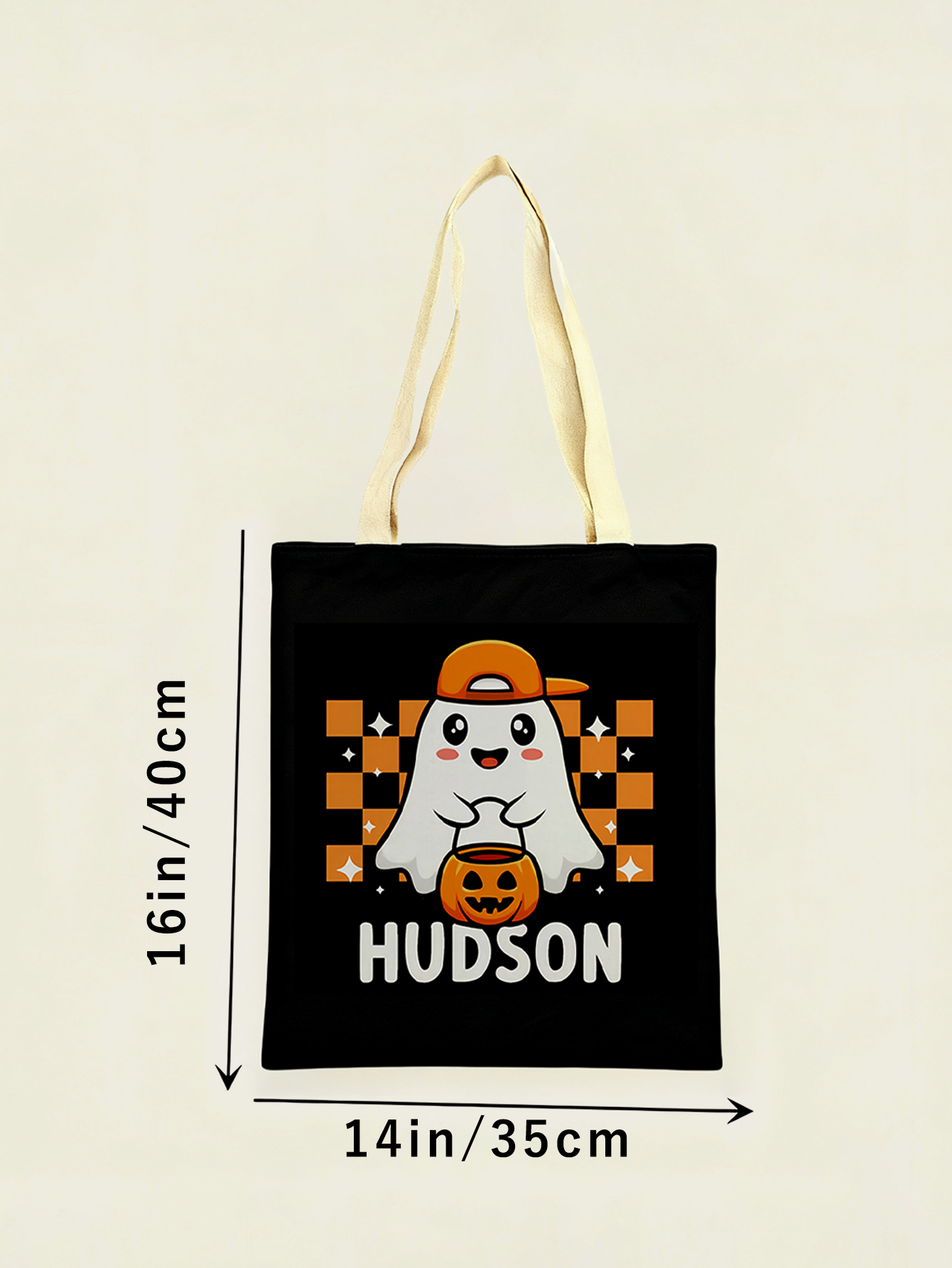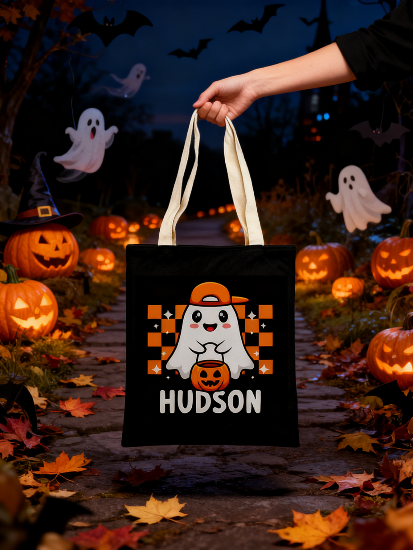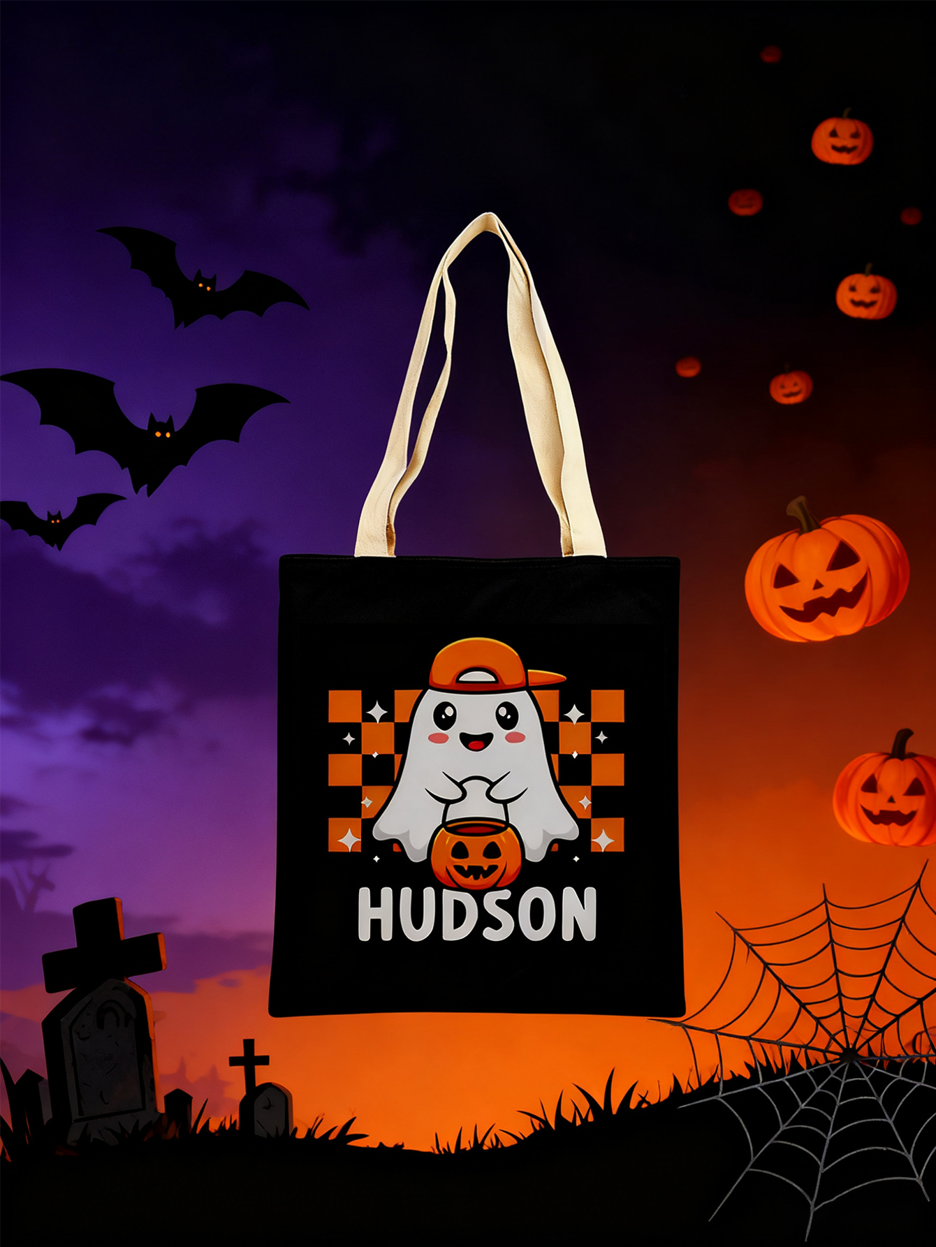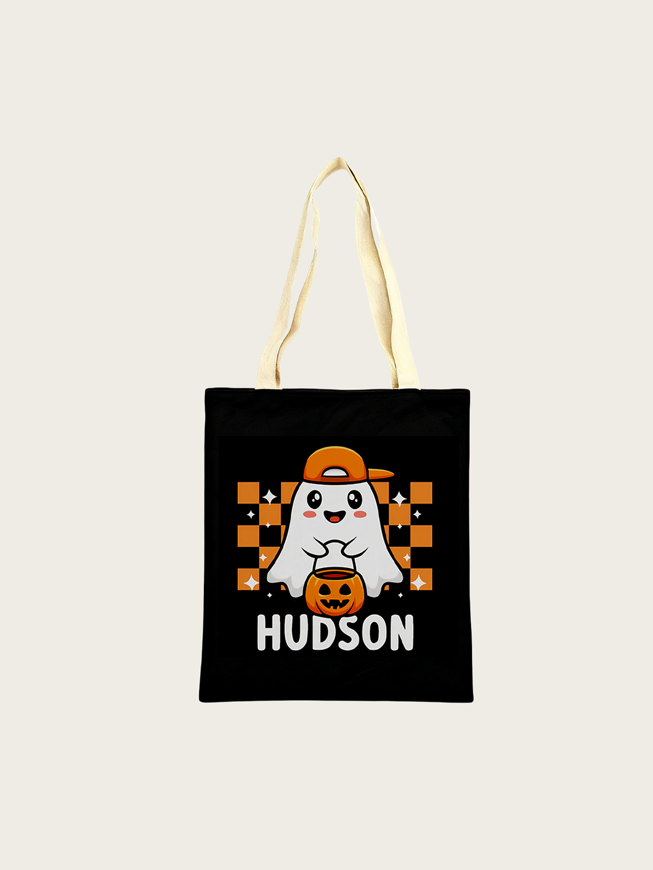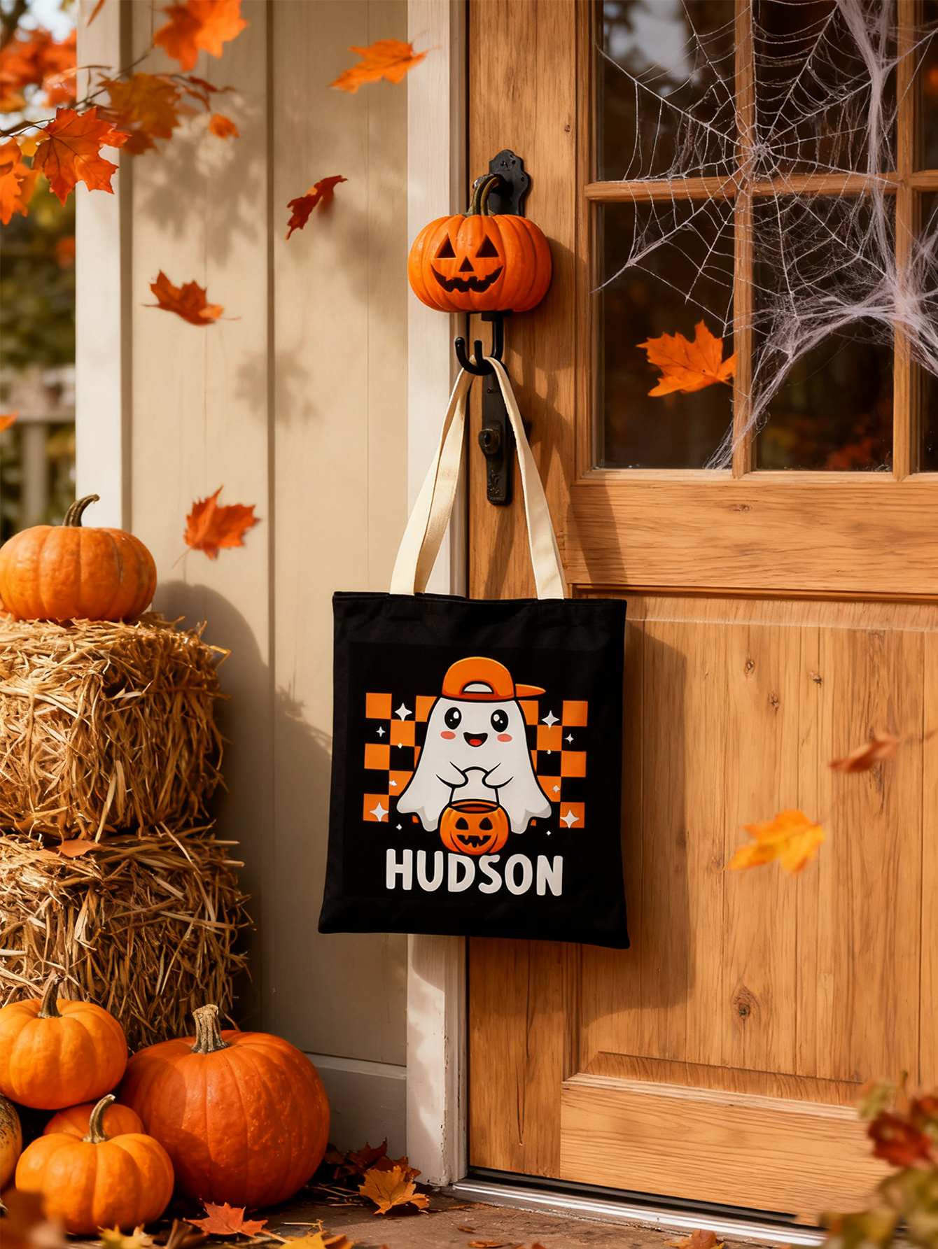 A fun and festive tote featuring a cheerful ghost design. Add your name for a personal touch and enjoy Halloween in style.