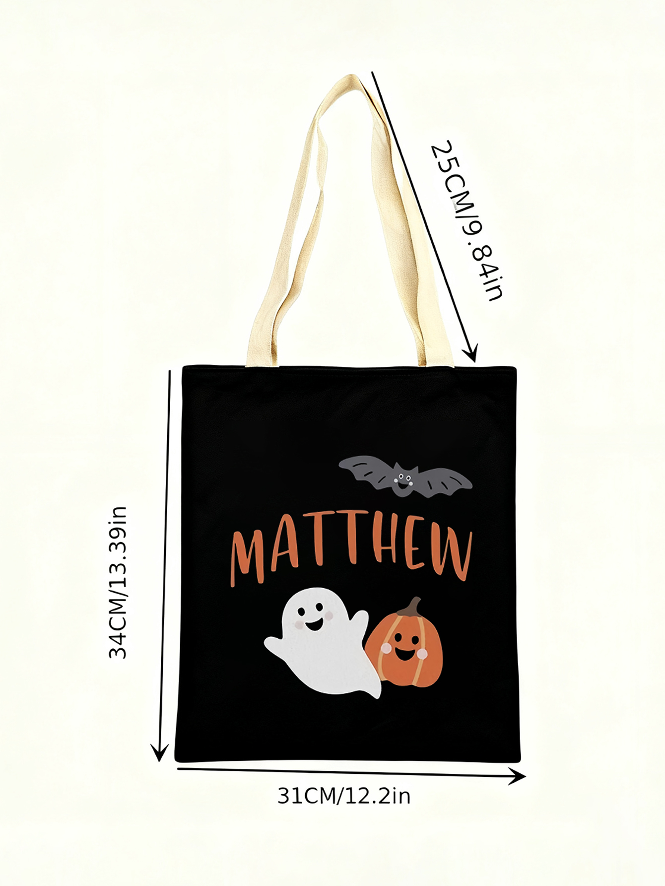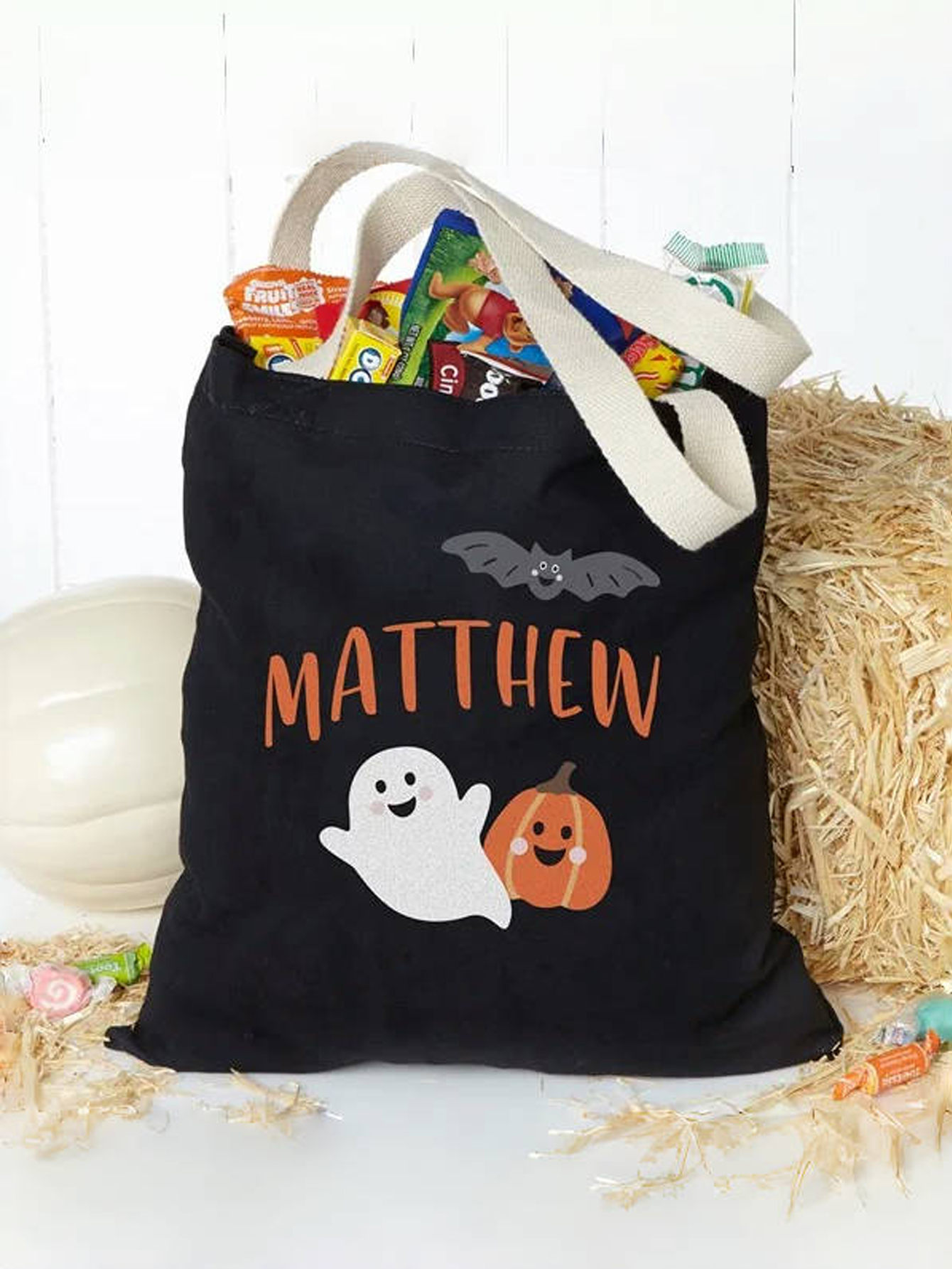 Make this Halloween unforgettable with the Custom Halloween Print Candy Bag. Featuring a cheerful ghost, smiling pumpkin, and a playful bat, this tote captures the fun of spooky season in the cutest way.