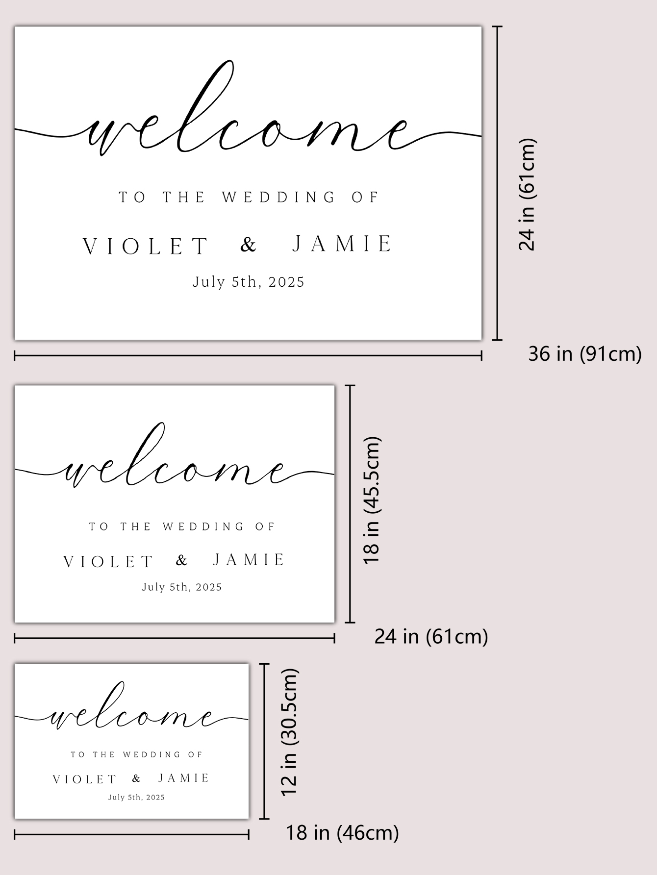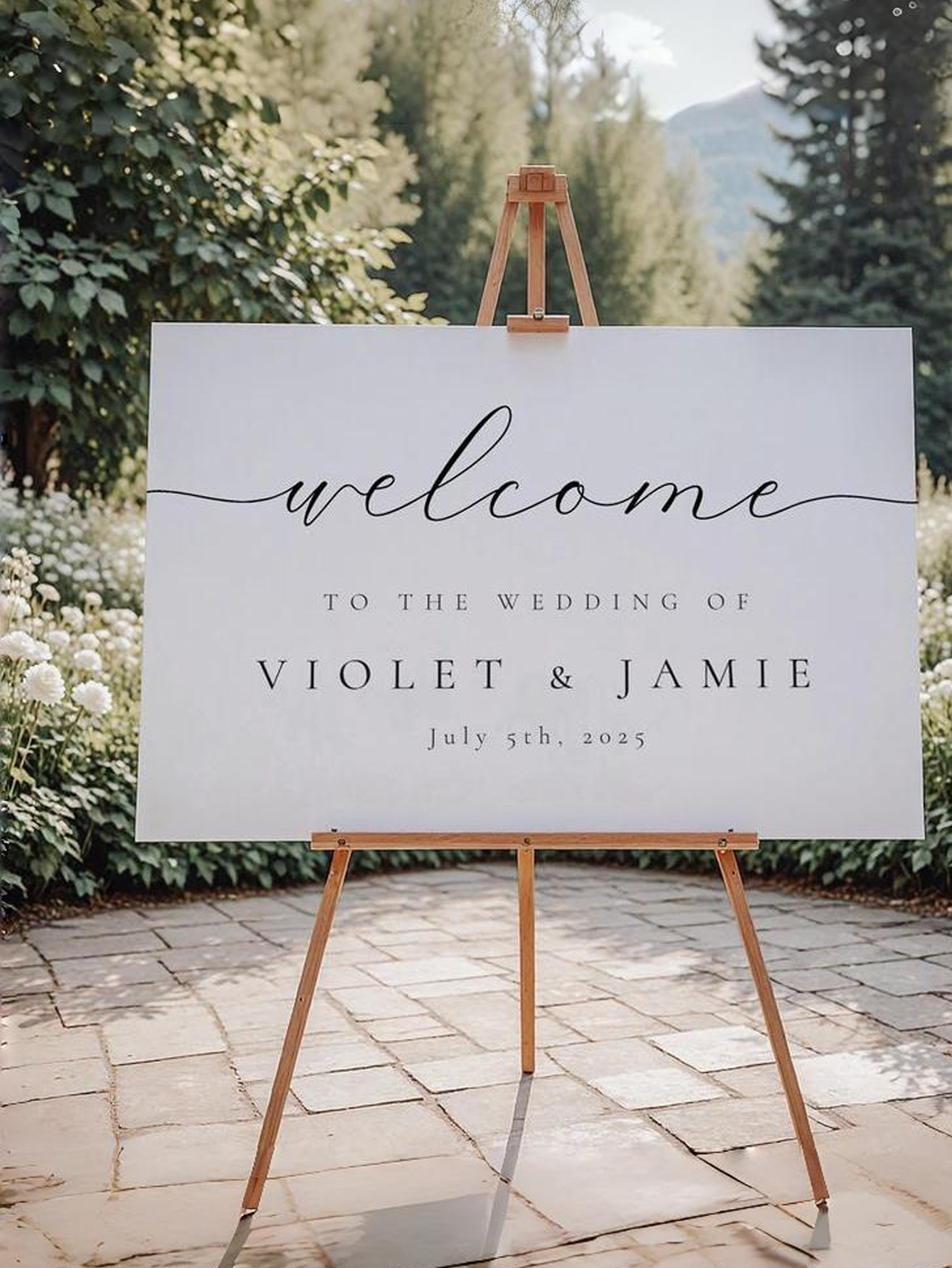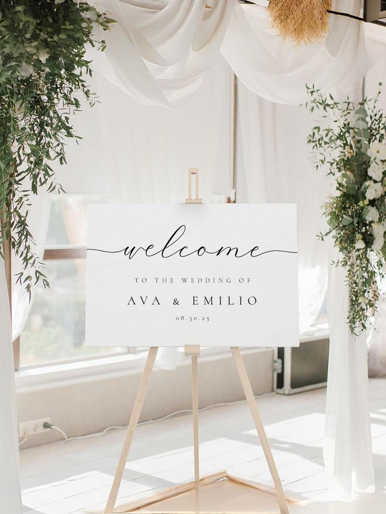 A modern and elegant wedding welcome sign made from strong PVC material, fully customizable for your special day.