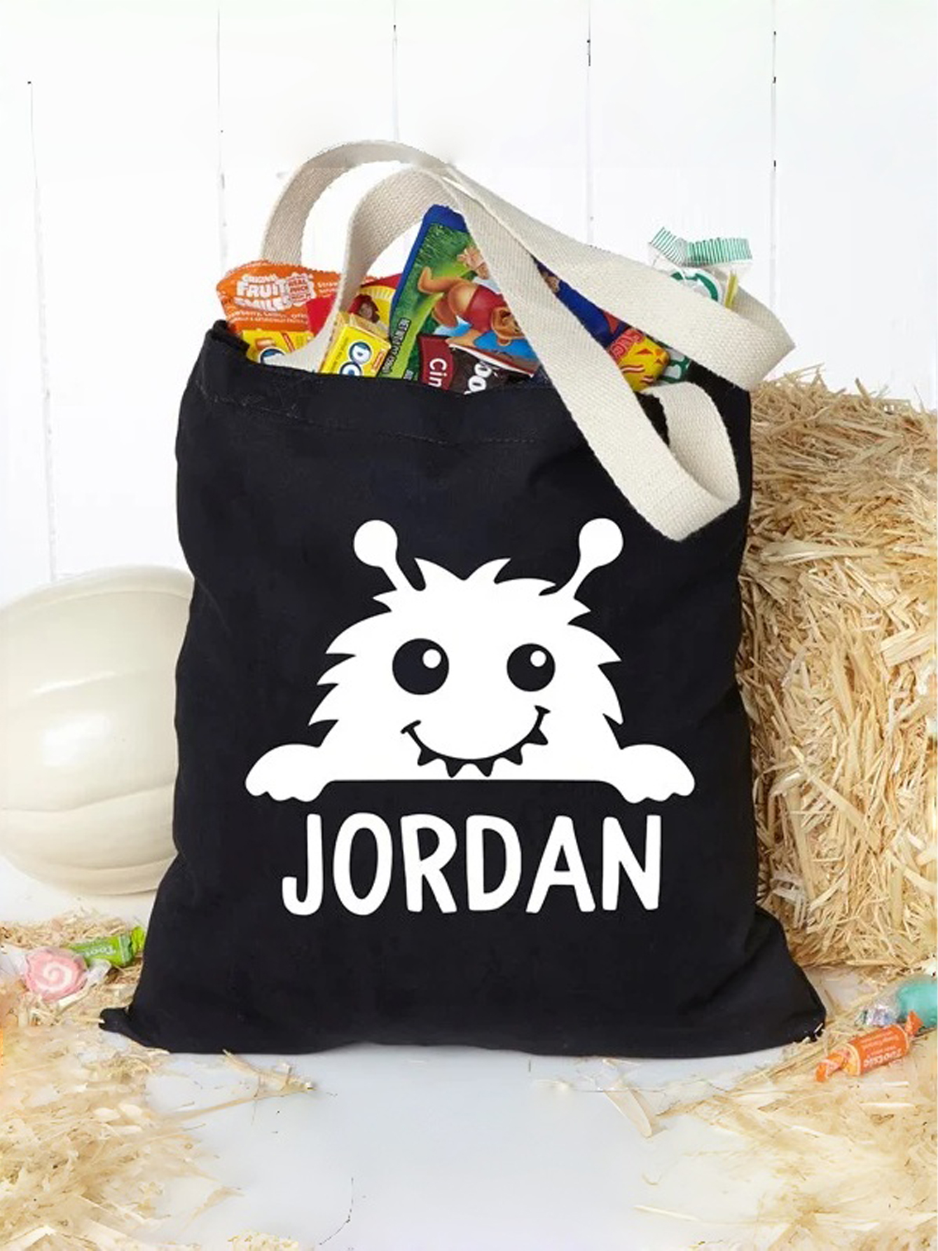 Add a spooky yet adorable twist to your child’s Halloween with the Monster-Themed Personalized Halloween Candy Bags. Featuring a bold black canvas design with a playful white monster graphic, this tote is perfect for kids who love to show off their Halloween spirit.
