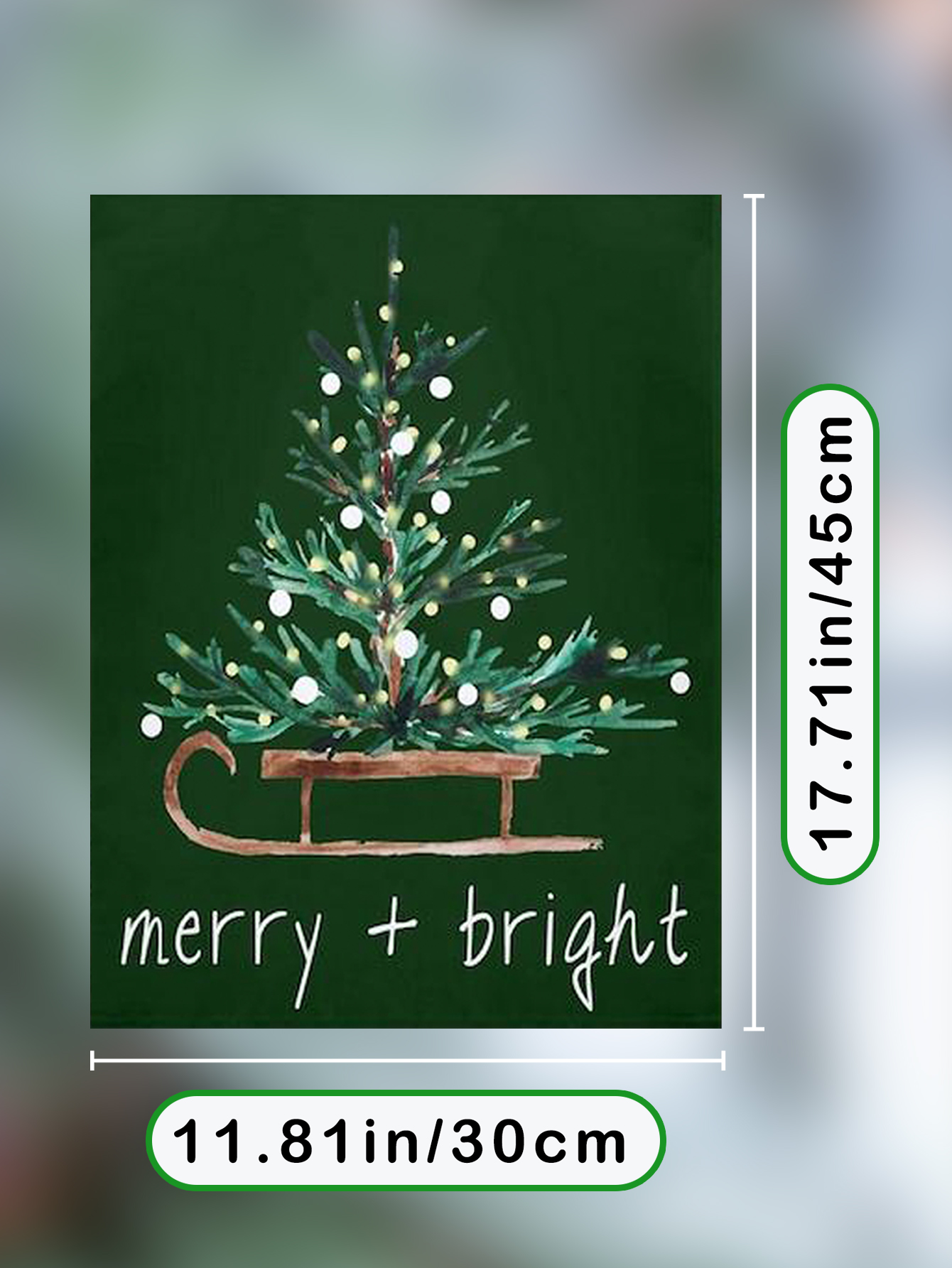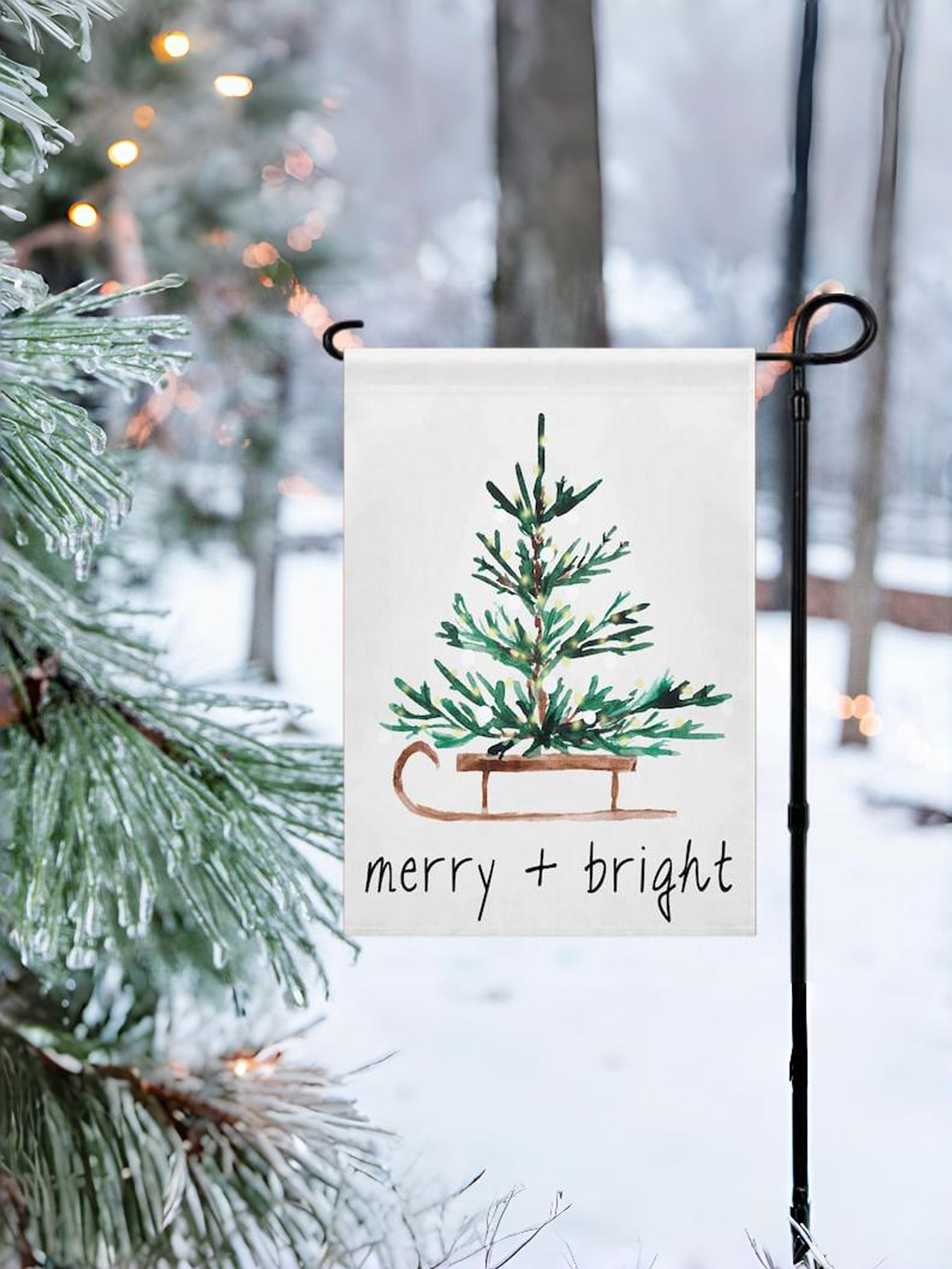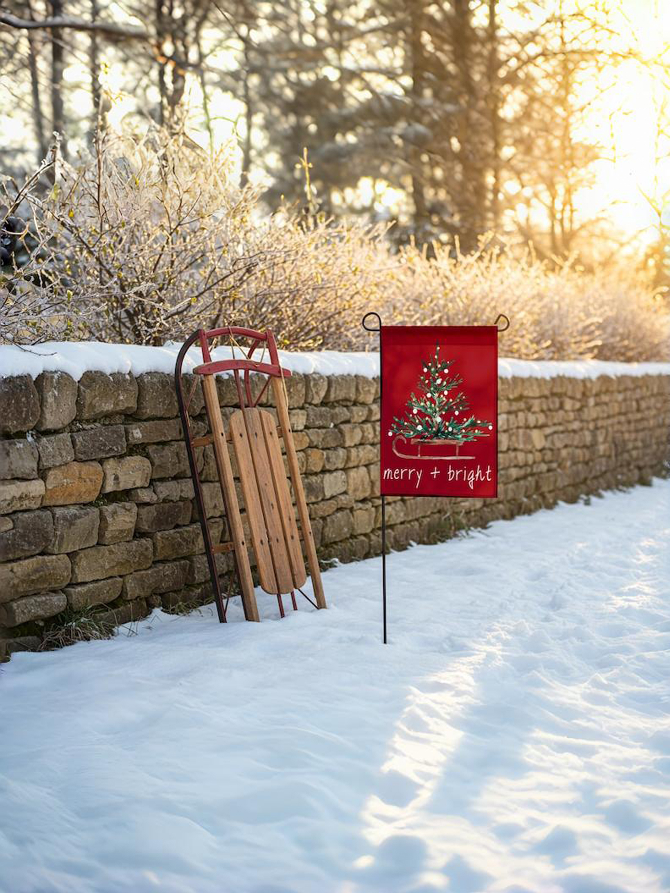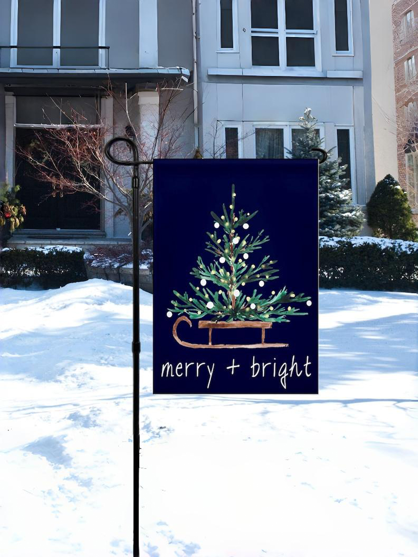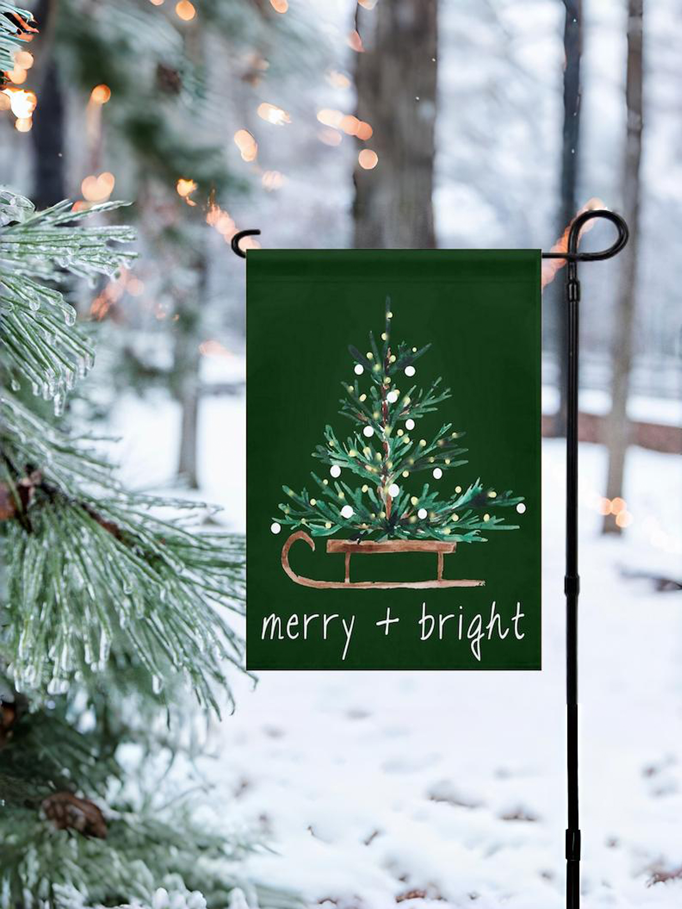 Celebrate the season in style with our Personalized Christmas Garden Flag. Featuring a deep green background, a charming sled with a lit Christmas tree, and the joyful phrase “Merry + Bright”, this festive decoration instantly brightens any outdoor space.