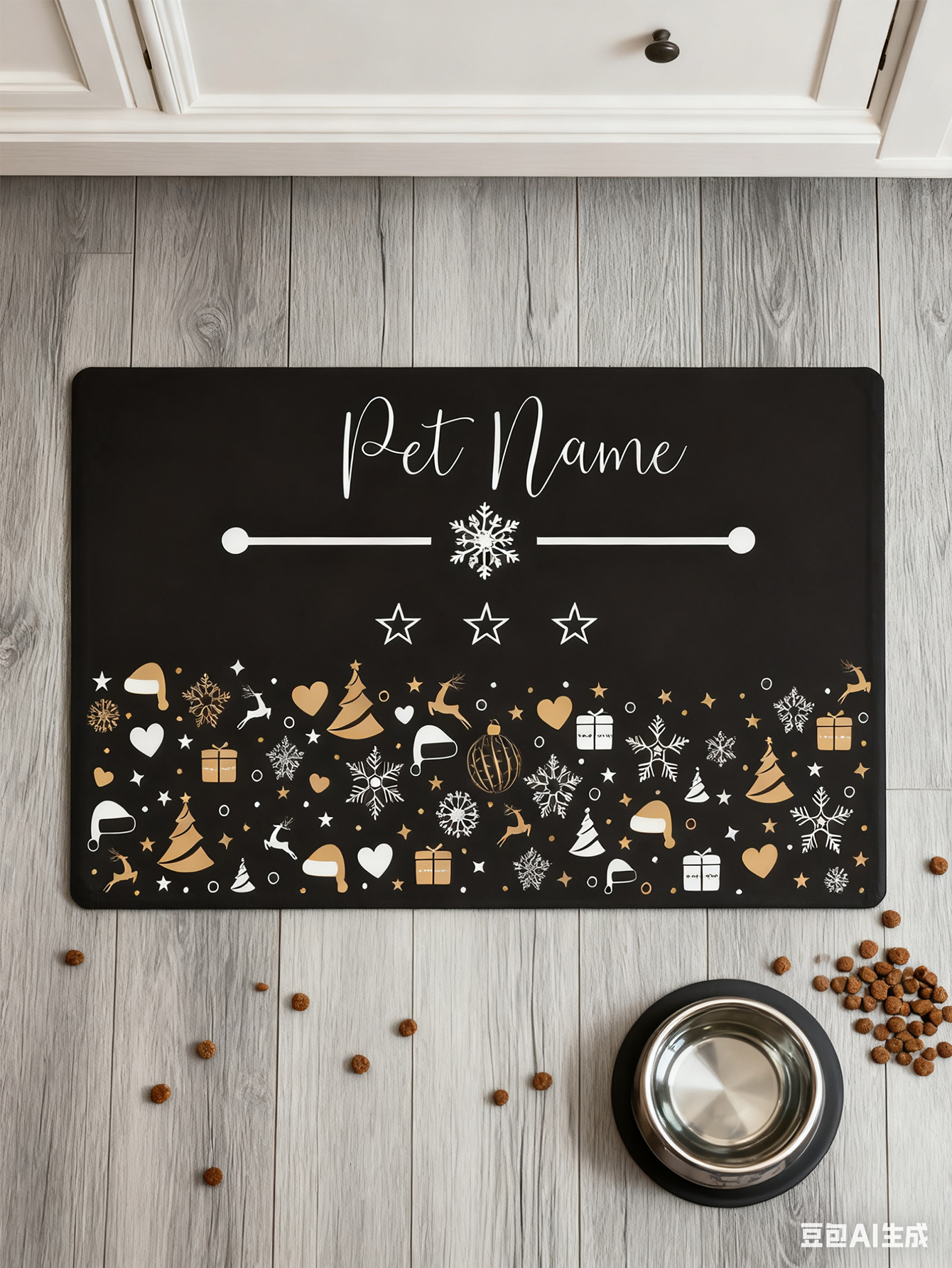 Make your pet’s mealtime merry and bright with our Customized Christmas Pet Feeding Mat from Kstom.com. This festive mat blends function with holiday cheer, featuring charming Christmas elements like snowflakes, stars, and gift boxes — all beautifully printed against a sleek dark background.