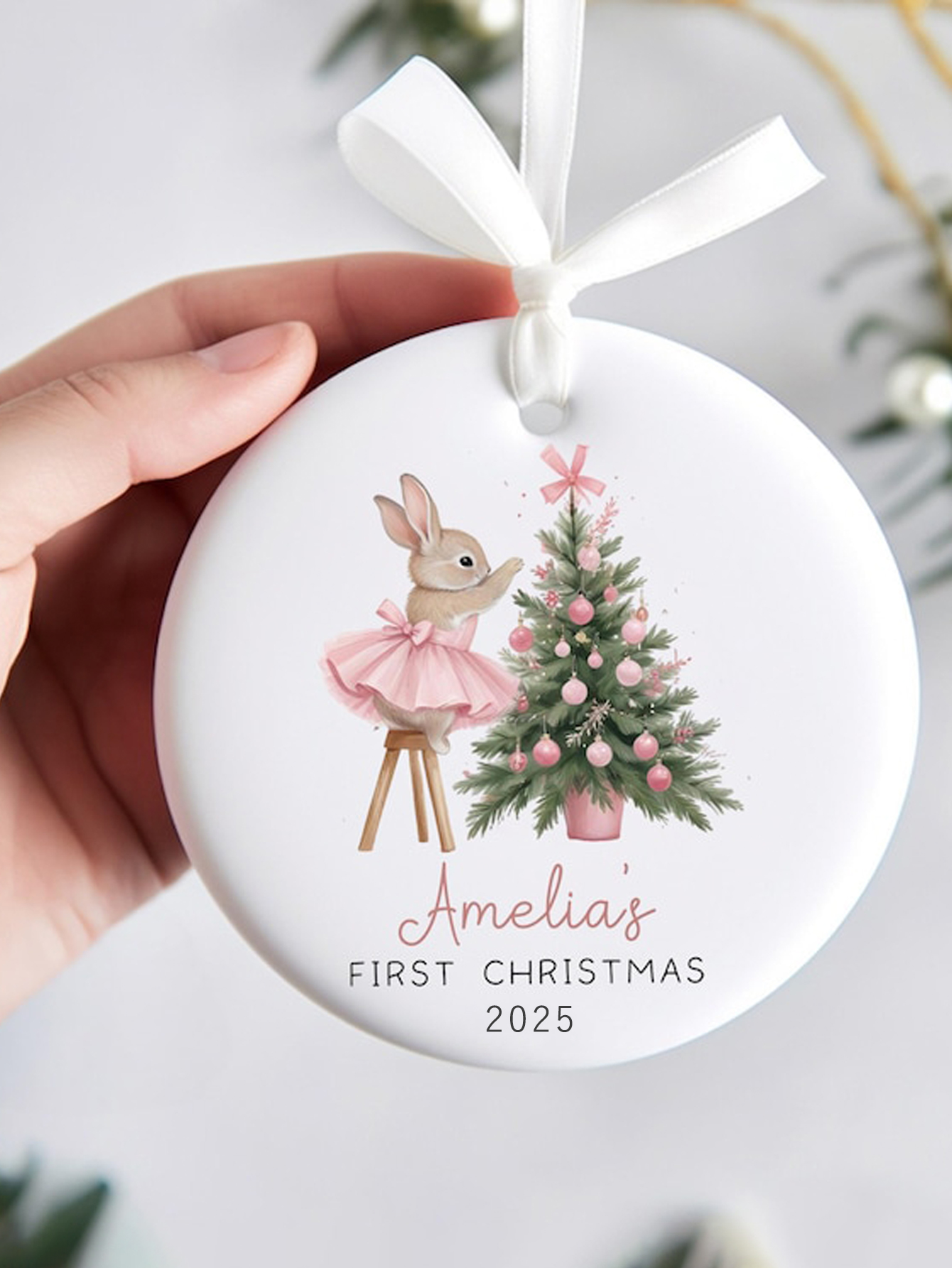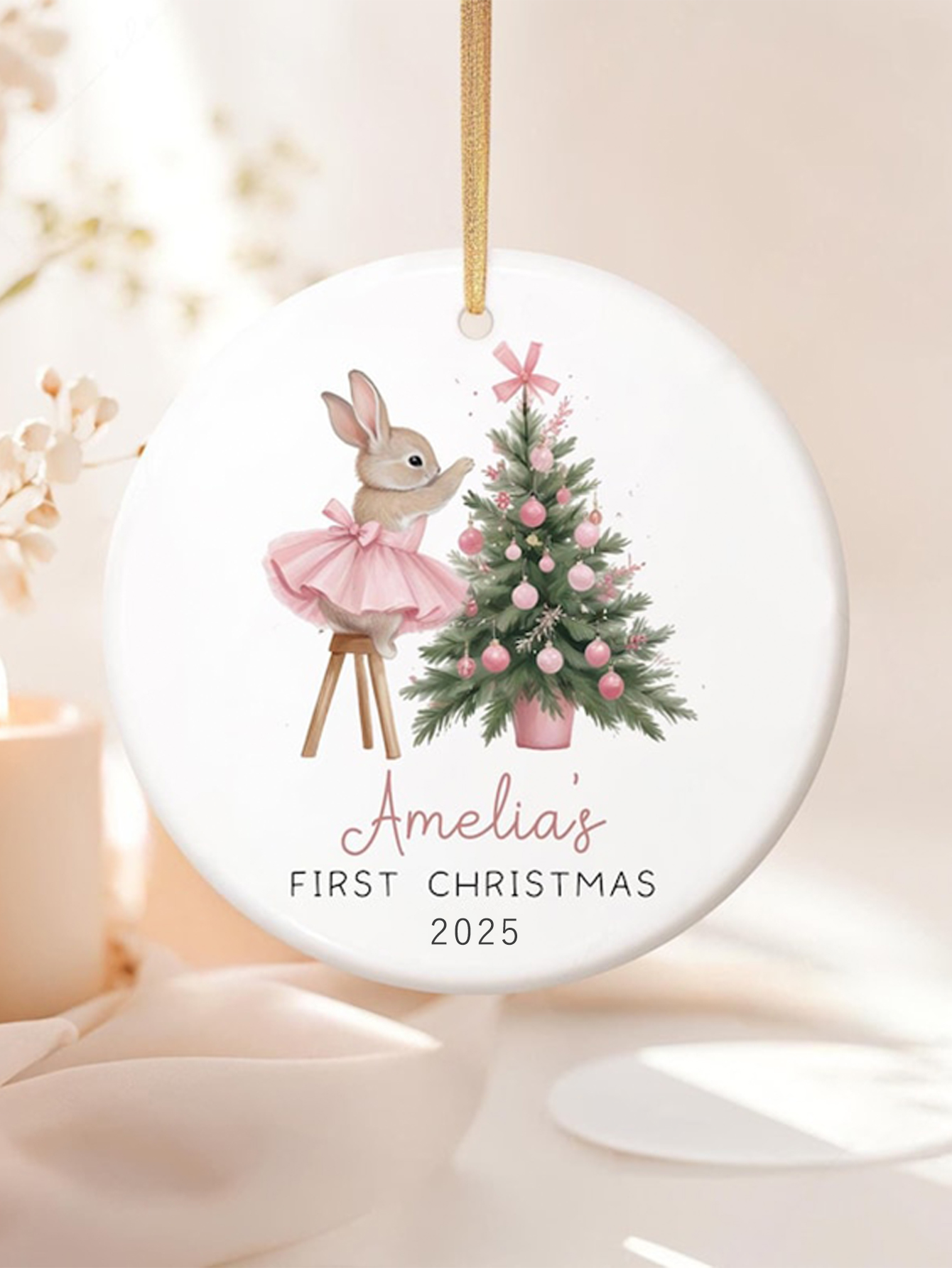 Celebrate the joy of a first holiday season with our Personalized Baby’s First Christmas Ornament, available now at Kstom. Thoughtfully designed, this ornament captures the warmth and wonder of the holidays with a charming illustration of a bunny in a tutu beside a decorated Christmas tree.