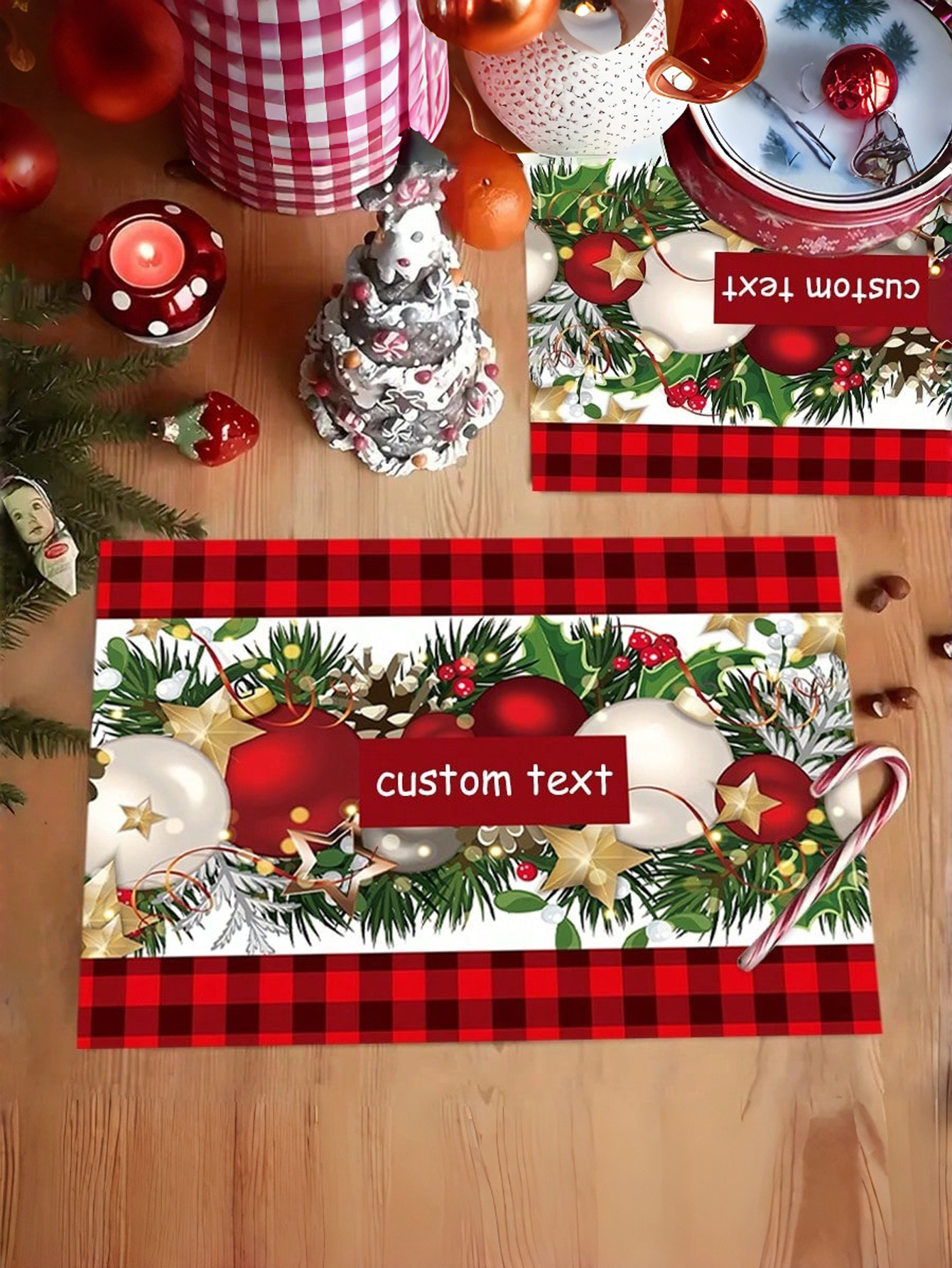 Celebrate the holidays in style with our Personalized Christmas Plaid Placemats from Kstom.com. Featuring a classic red-and-black checkered border paired with elegant Christmas ornaments, pine leaves, and festive accents, these placemats instantly make your dining space warm and inviting.