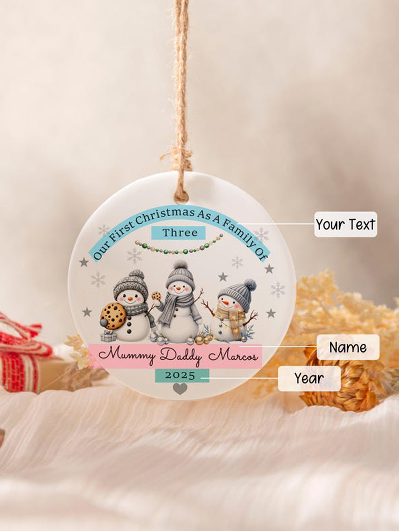 Each ornament features a cute snowman family illustration, customizable with your family’s names, the year, and a personal message. Whether it’s your very first Christmas as new parents or as a growing family, this ornament will serve as a treasured keepsake for years to come.